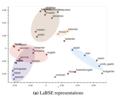 LabSE 的嵌入图显示了受语言系属分类影响的不同语言集群。例如,罗曼语(紫色,下同)与斯拉夫语(棕色,下同)属于不同的区域。这一发现与 之前研究 由 NMT 系统学习的中间表示的研究结果相吻合。