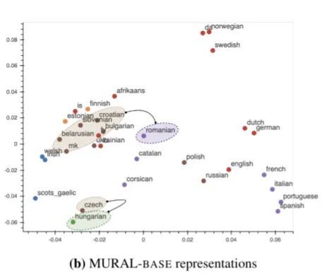 MURAL 以图像和翻译为轴心这一事实似乎为语言关联性增添了额外的观点,因为它是在深度表示中学习的,超越了在纯文本环境中观察到的语族集群。