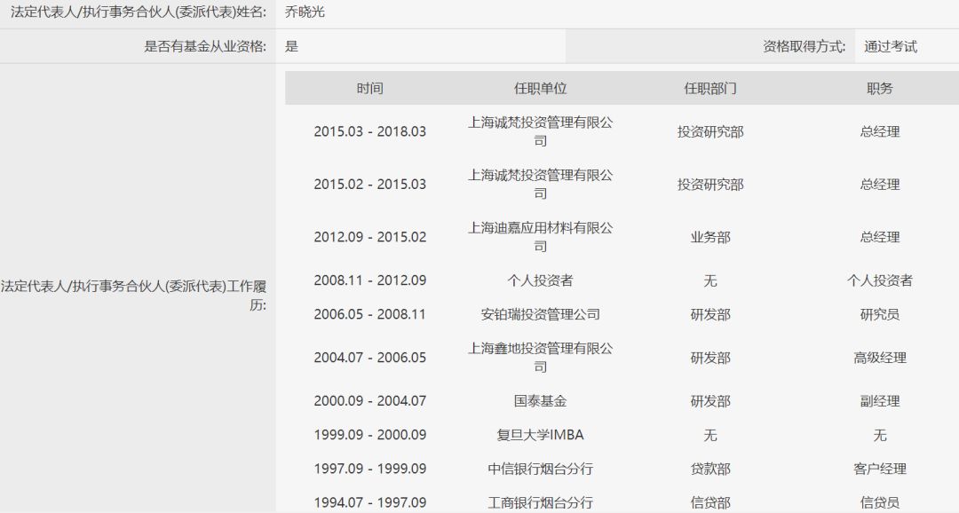 根据基金业协会官网披露的私募基金管理人公示信息显示,乔晓光曾在工商银行、中信银行、国泰基金、鑫地投资、安铂瑞投资、上海迪嘉等就职过,2015年2月就任诚梵投资总经理职位。
