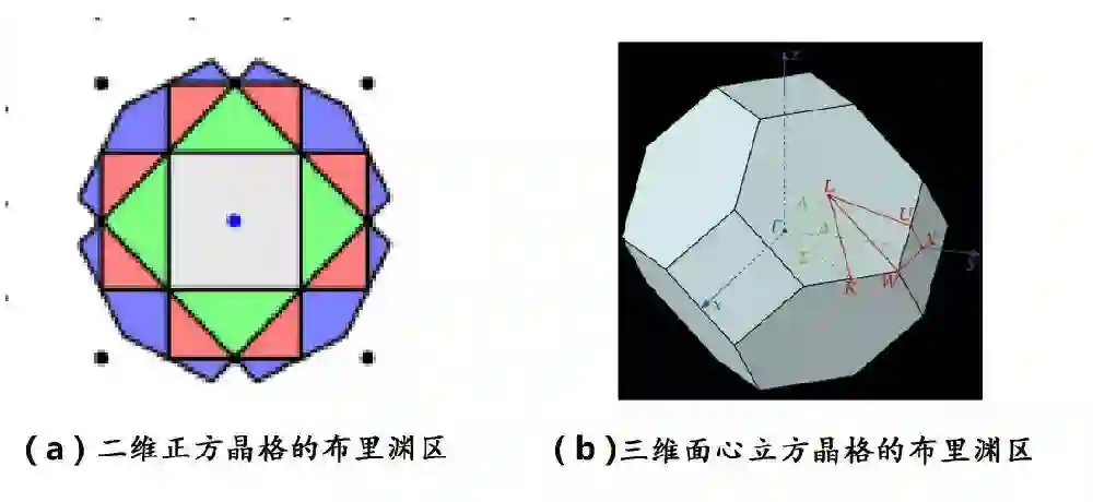 如上所述,在数学和固体物理学中,第一布里渊区(Brillouin zone)是动量空间中晶体倒易点阵的原胞。一维的第一布里渊区很简单,只是一段k值可取的范围(-π/d到π/d)。即使扩大到第二布里渊区,也只不过是将取值范围分别向两边扩展而得到两个新的线段:(-2π/d, -π/d)和(π/d, 2π/d);第三布里渊区也是用类似的扩展而得到。如果是2维或3维的情况,就要复杂多了,从图9中的两个例子可以看出这点。图9a中,中间的白色方块是二维正方晶格的第一布里渊区,其余的颜色从中间向外扩展,分别对应着第二、三、四布里渊区。图9b则只是画出了面心立方晶体的第一布里渊区。通常用到的也只有第一布里渊区。
