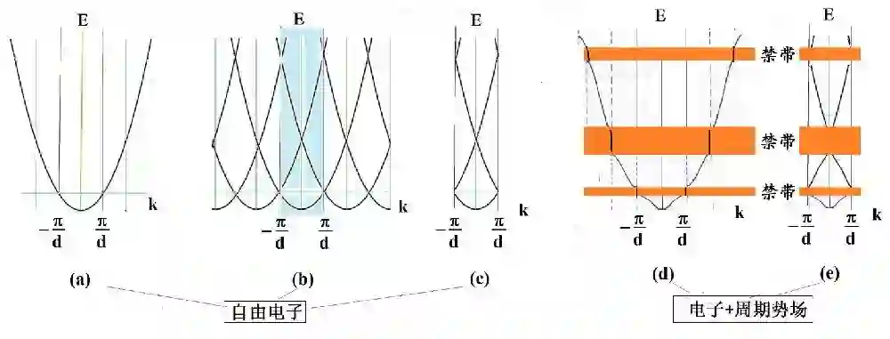 图8a所示的自由电子能量波矢曲线,是在势场为0的情形下得到的抛物线。当然,零势场同样也可看作是周期势场,为了使自由电子的能量本征值也符合平移不变性的要求,可将图8a中的抛物线,沿着最小的倒格子原胞边界(图中的π/d和-π/d轴)反复折叠,最后得到图8b所示的曲线。