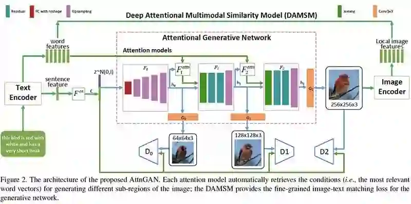 通过新颖的注意力生成网络,AttnGAN可以通过关注自然语言描述中的相关单词,来合成图像的不同子区域的细粒度细节。此外,提出了一种深度attentional多模态相似度模型,来计算用于训练生成器的细粒度图像文本匹配损失。