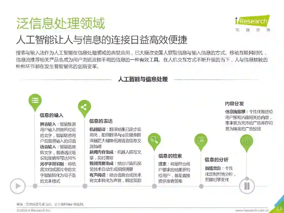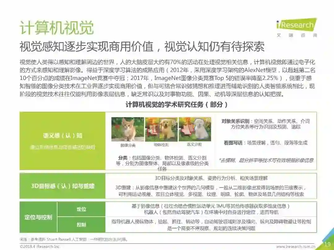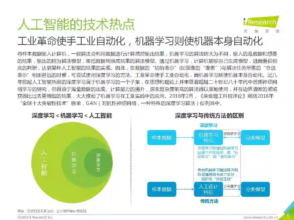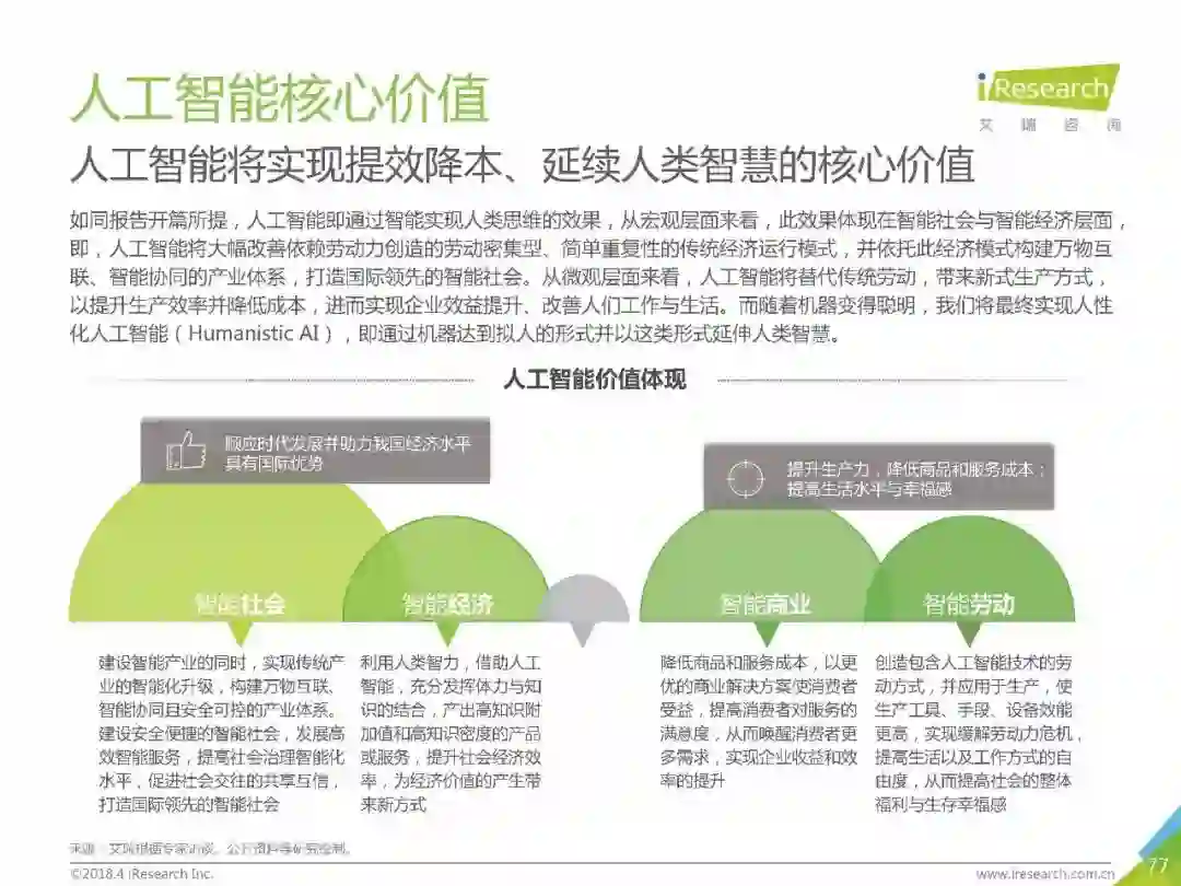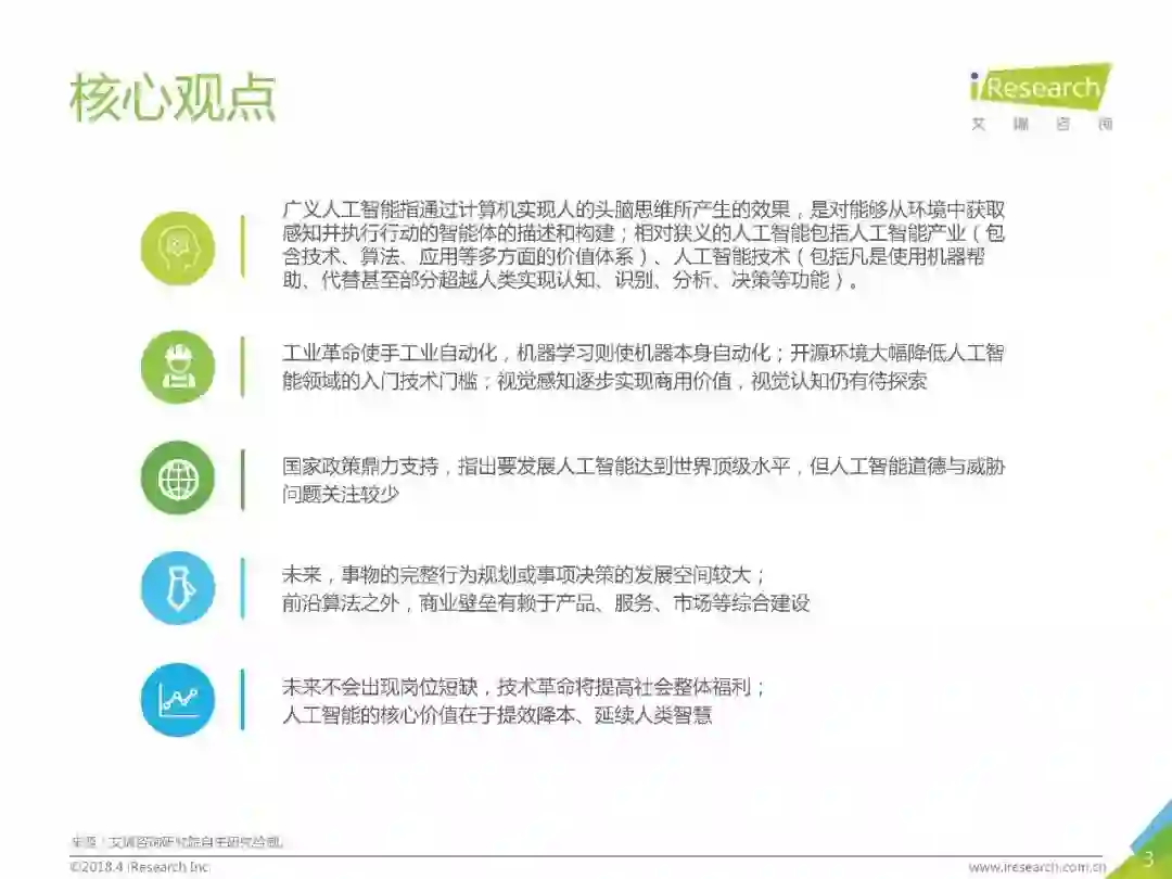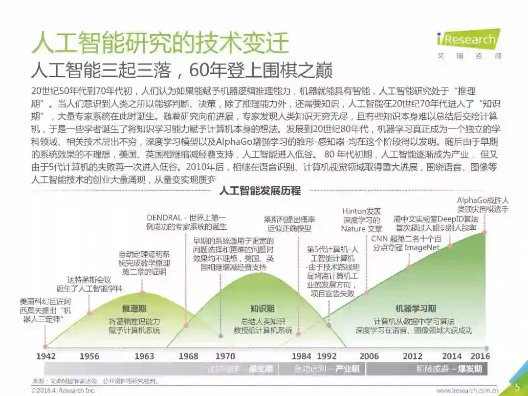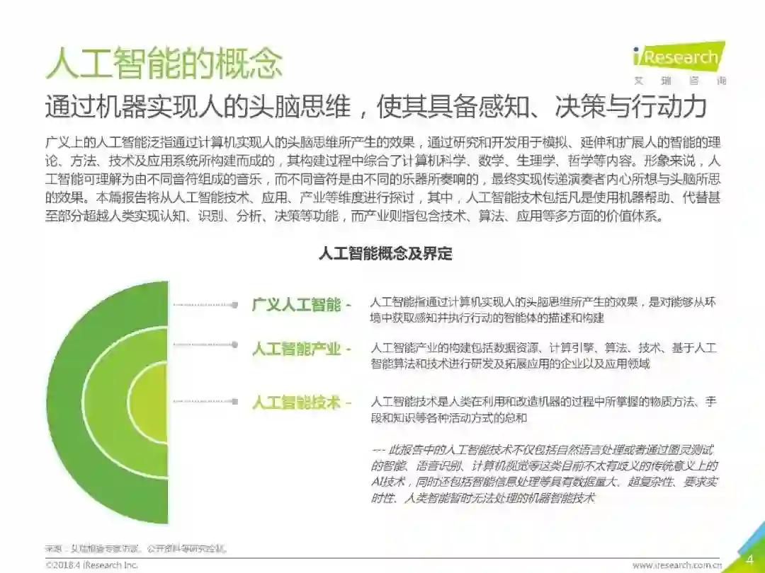 广义人工智能指通过计算机实现人的头脑思维所产生的效果,是对能够从环境中获取感知并执行行动的智能体的描述和构建;相对狭义的人工智能包括人工智能产业(包含技术、算法、应用等多方面的价值体系)、人工智能技术(包括凡是使用机器帮助、代替甚至部分超越人类实现认知、识别、分析、决策等功能)。本篇报告将从人工智能技术、应用、产业等维度进行探讨,其中,人工智能技术包括凡是使用机器帮助、代替甚至部分超越人类实现认知、识别、分析、决策等功能,而产业则指包含技术、算法、应用等多方面的价值体系。