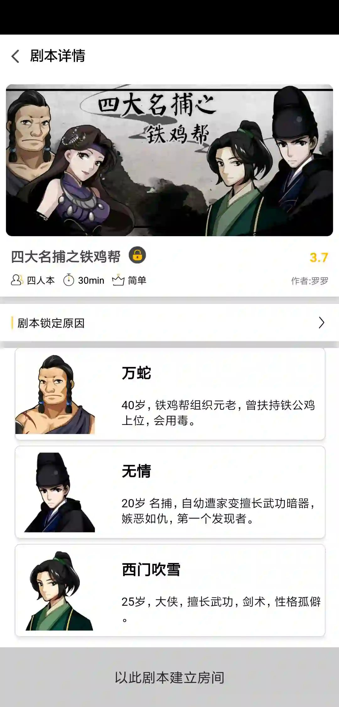 小方在回家的地铁上拿着手机,像是在沉思,一会儿便在手机上打出了这行字。他加入了一个剧本叫《四大名捕之铁鸡帮》的推理游戏里,目前的身份是西门吹雪,在游戏里的任务是要和其他三个同伴一起合作,找出杀害野鸡帮首领铁公鸡的凶手。