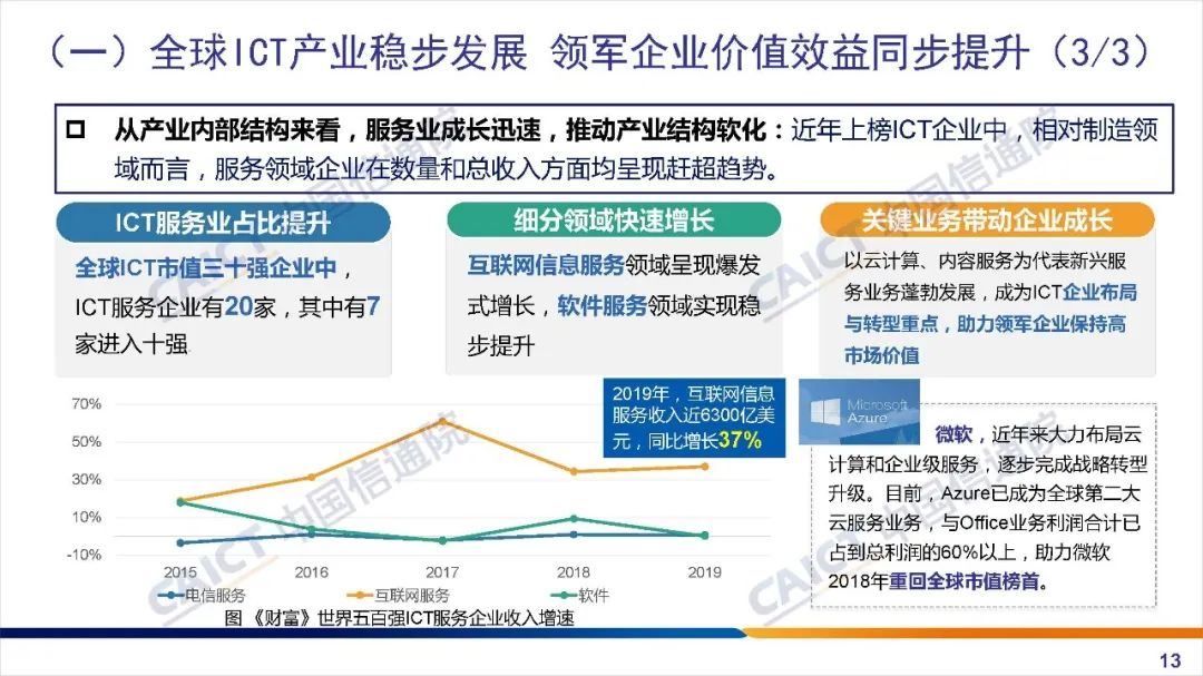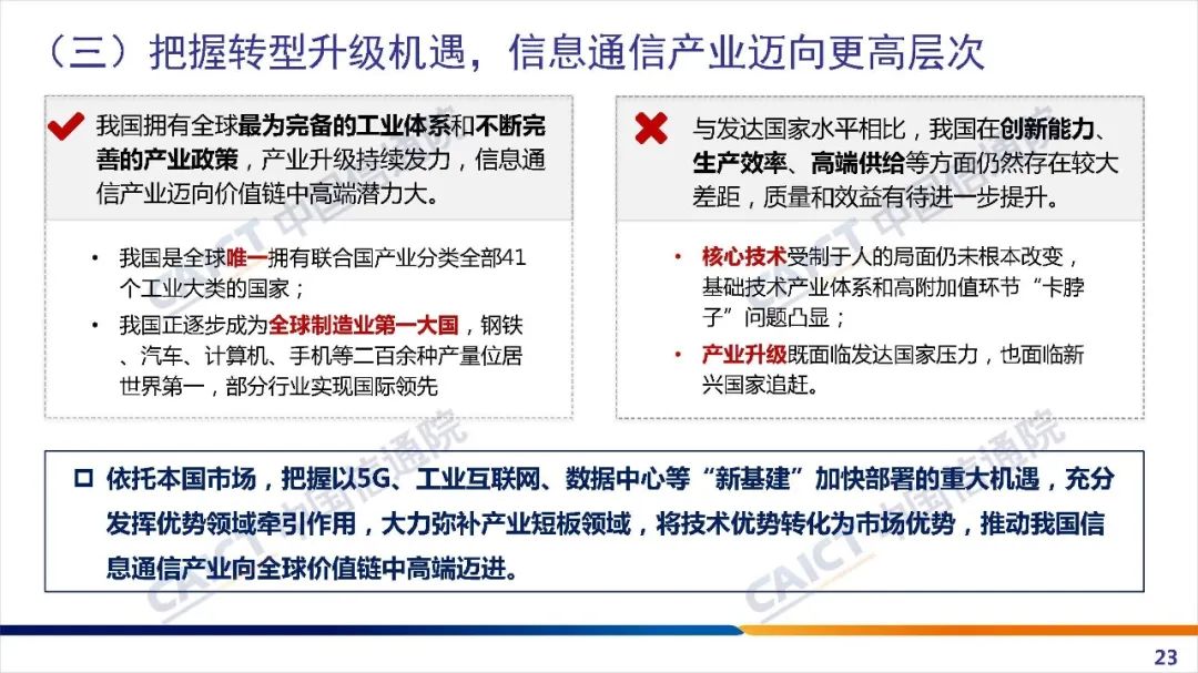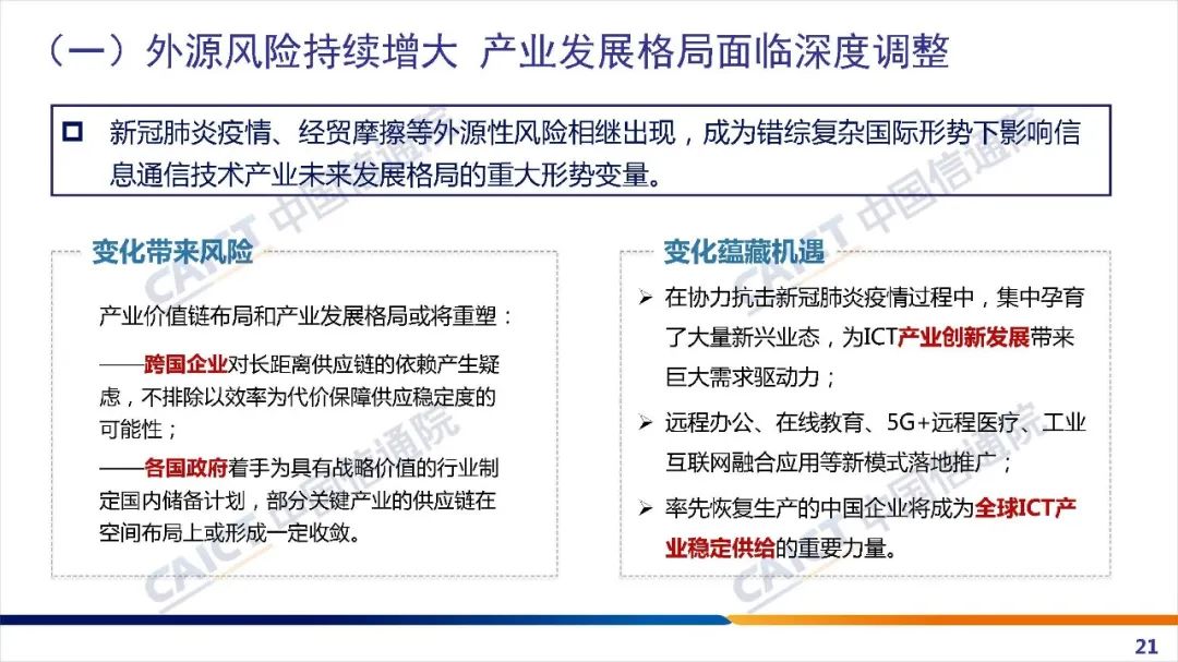 报告重点分析了影响信息通信产业未来发展格局的重大形势变量,对当前全球信息技术演进趋势、产业发展态势进行了综合研判;并基于ICT上市企业运行数据分析了我国产业发展的主要特征、面临的机遇和挑战,提出新形势下加快构建更高层次、更加开放信息通信产业体系的若干建议。