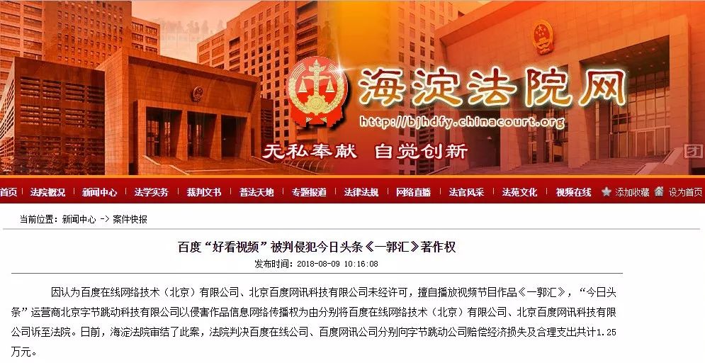 2018年8月,因认为百度在线网络技术(北京)有限公司、北京百度网讯科技有限公司未经许可,擅自播放视频节目作品《一郭汇》,北京字节跳动科技有限公司以侵害作品信息网络传播权为由分别将百度在线网络技术(北京)有限公司、北京百度网讯科技有限公司诉至法院。最终,法院判决百度在线公司、百度网讯公司分别向字节跳动公司赔偿经济损失及合理支出共计1.25万元。