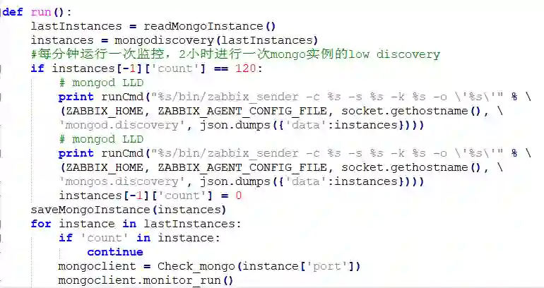 run函数用来组装数据,并通过zabbix_sender来发送LLD信息,完成实例的添加: