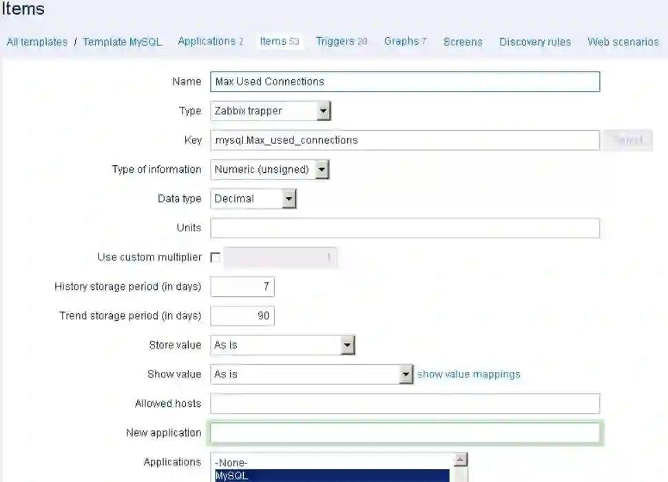 因为新版本的MySQL对硬件的利用率很高,这里没有使用多实例监控,所以没有过多难点。在MySQL模板里定义item为trapper类型,通过zabbix_sender将dict中的数据发送给zabbix_server就完成了。