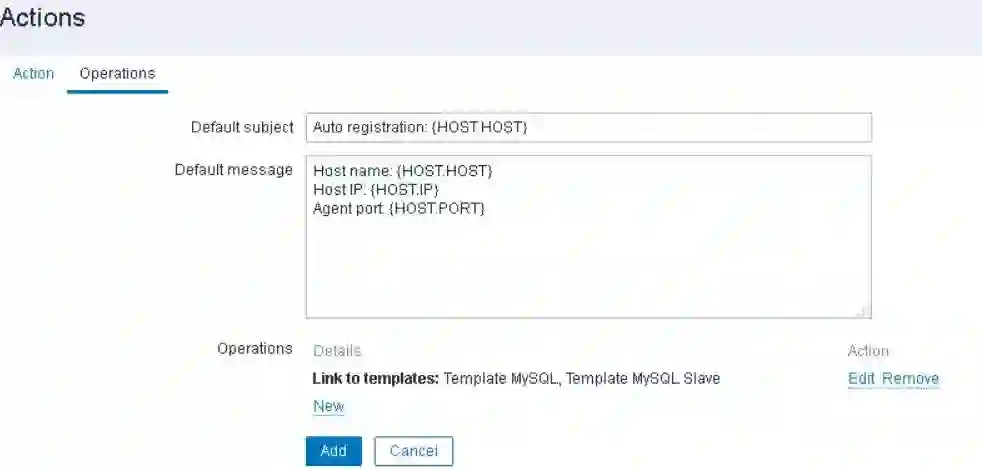 这里需要注意的是通过Auto Register关联模板,当添加主机、加入主机组后,关联到相应的模板,才能使整个流程形成闭环。
