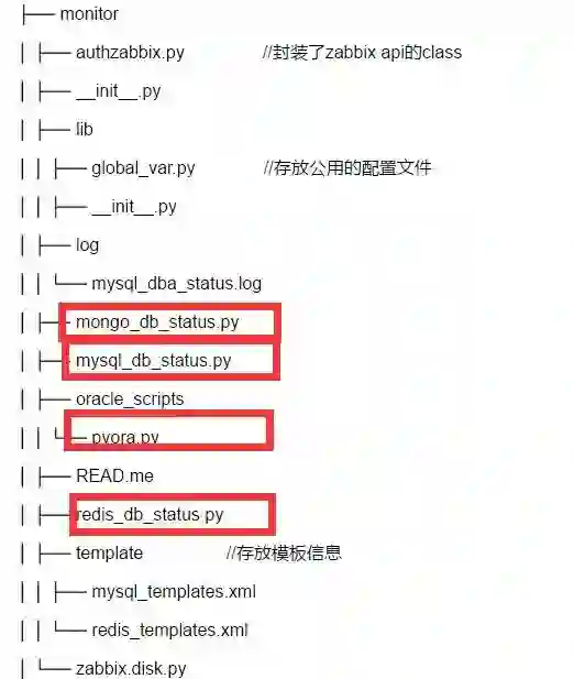 其中authzabbix.py封装了共用的Zabbix API的方法,Lib目录主要存放全局的变量信息,包括Zabbix API地址、Zabbix用户、各类数据库的监控用户、路径等信息,Log目录用于存放监控日志,Template用来存放Zabbix模板信息。