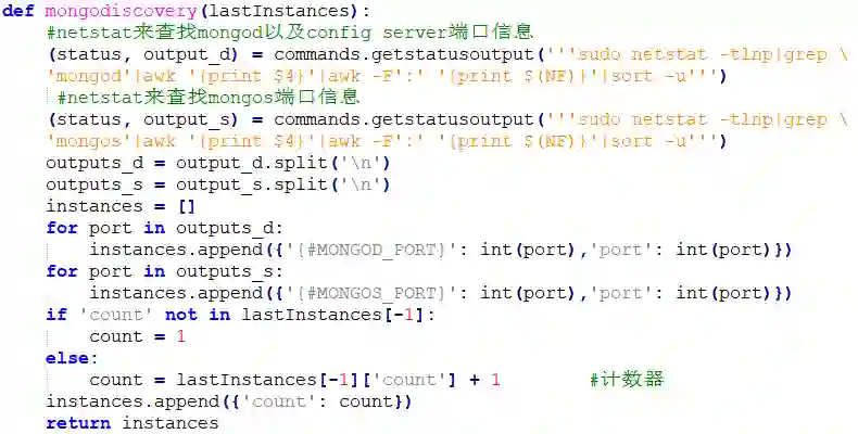 发现实例的代码如下,通过netstat查询出这台主机上所有的不同的Mongo实例,实例的信息,放入一个List里面返回: