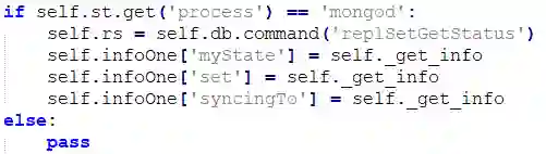 判断实例类型,收集相应数据并发送给Zabbix Server,这里监控Mongo使用的是PyMongo包,通过Mongo中的管理命令serverStatus、replSetGetStatus(mongos无此命令,需要过滤)来获取信息,并进行处理。代码片段如下: