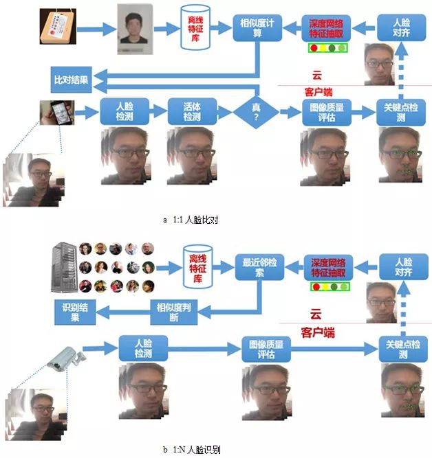 实际上,一个完整的人脸识别实用系统除了包括上述识别算法以外,还应该包括人脸检测,人脸关键点定位,人脸对齐等模块,在某些安全级别要求较高的应用中,为了防止照片、视频回放、3D打印模型等对识别系统的假冒攻击,还需要引入活体检测模块;为了在视频输入中取得最优的识别效果,还需要引入图像质量评估模块选择最合适的视频帧进行识别,以尽可能排除不均匀光照、大姿态、低分辨和运动模糊等因素对识别的影响。另外,也有不少研究者和公司试图通过主动的方式规避这些因素的影响:引入红外/3D摄像头。典型的实用人脸识别方案如图5所示。