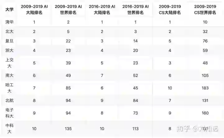 这个排序大致能够反映各大高校CS/AI专业的国际学术前沿整体水平,而且通过AI领域和CS整体的排名反差,可以观察到该高校AI方向的强势程度,例如复旦的AI排名高于其CS排名2位,哈工大AI排名高于CS排名3位等等,说明这两所大学的AI方向相对比较强势。而且,还可以看出,国内高校AI领域的世界排名明显超过CS整体的世界排名,说明国内高校在AI方面更接近世界前沿水平。