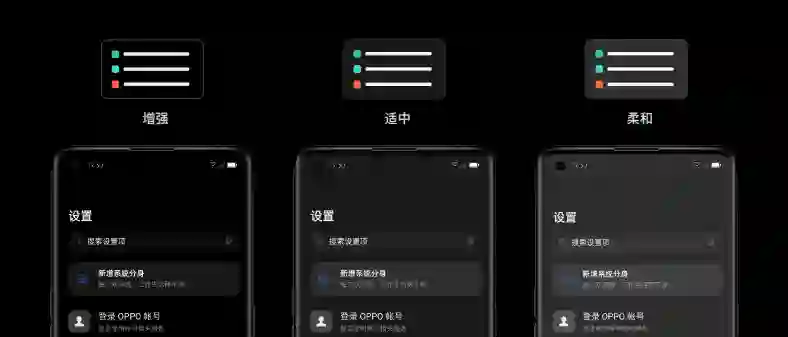 比如在 Google 的设计语言中深色主题的对比度应当符合无障碍规范,但原生 Android 的深色主题依然自相矛盾地使用了纯黑色作为背景;ColorOS 11 在此基础上设计了增强、适中、柔和三个暗色模式层级,相比原生 Android 以及市面上大部分只是简单「抄作业」的定制系统体验更加友好。