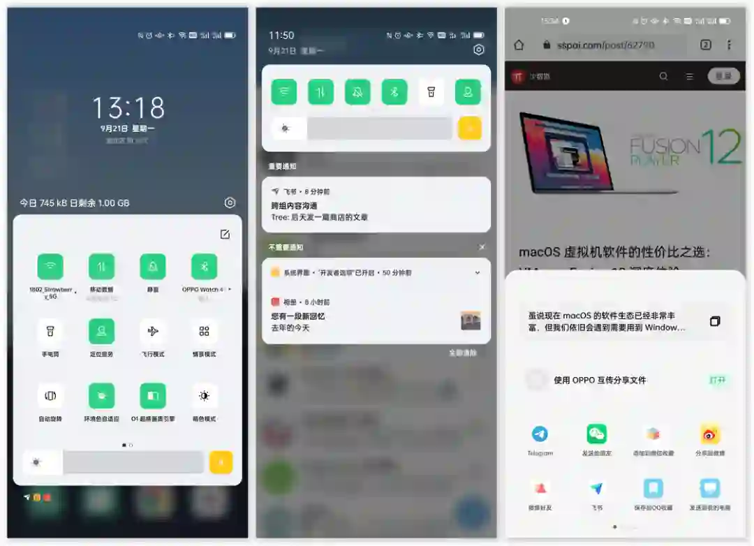 紧随原生 Android 的步伐,ColorOS 11 暗藏了许多随 Android 11 底层而来的新特性,比如更加顺畅的横/竖屏旋转动画、分享菜单支持文本内容预览、输入法键盘支持扩展信息(比如 1Password 自动填充)、通知中心支持动态模糊等等,这些都是「回归原生」带来的红利。