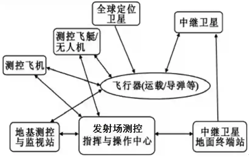 由天基测控资源 (包括全球卫星定位系统、跟踪与中继卫星系统)、空基测控资源(包括测控与监视飞机、无人机、飞艇)、地基(陆基和海基)测控与监视站以及航天发射场指挥与操作中心构成,如图 9所示。
