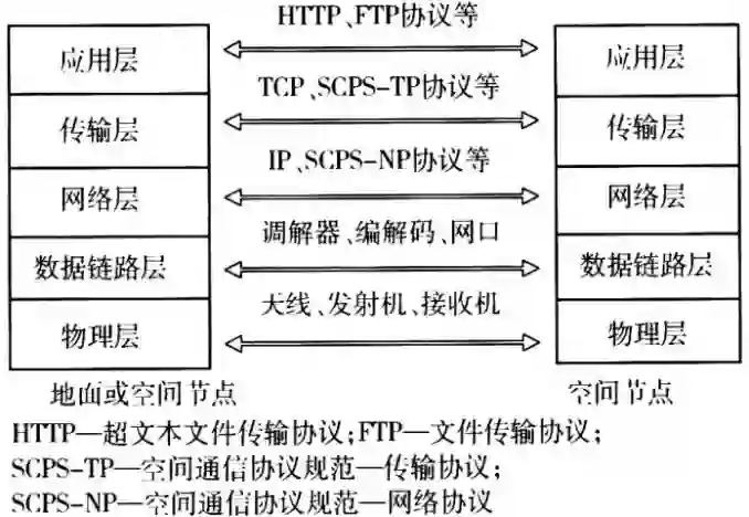 网络结构:采用异构开放的互操作标准,建立通用空间互联网的基础结构。它由骨干网、接入网、飞行器间的网络和临近行星网络组成。其中骨干网包括地面网络和空间网络、飞行器指挥控制中心的内联网、虚拟专用网等;接入网包括骨干网络与任务飞行器(含其上的局域网络)之间的通信接口;飞行器间的网络包括星座、编队、星群、无人机群中飞行器间的网络;临近行星网络包括连接空间运载器、着陆器、传感器等的网络。