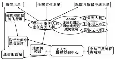 由天基资源(全球卫星定位系统、跟踪与中继卫星系统、通信卫星系统等)、临近空间资源(飞艇或临近空间站)、空基资源 (中继无人机)、地基资源(地面测控站和数据链终端),以及地面指挥控制中心等组成,如图 11所示。