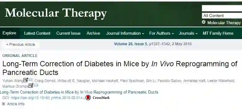 这项研究以 “Long-Term Correction of Diabetes in Mice by In Vivo Reprogramming of Pancreatic Ducts”为题发表在5月2日的《Molecular Therapy》杂志上。