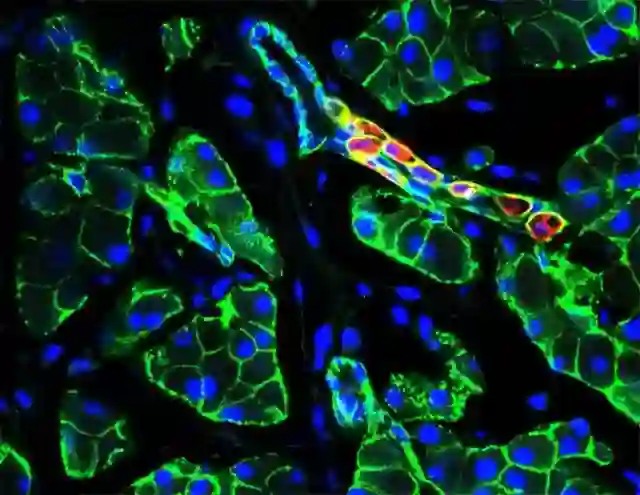 Injection of an adenoviral vector encoding pancreatic transcription factors induced insulin expression (red) in mouse pancreatic ducts. Ductal tissue is shown in green and nuclei in blue.YUHAN WANG