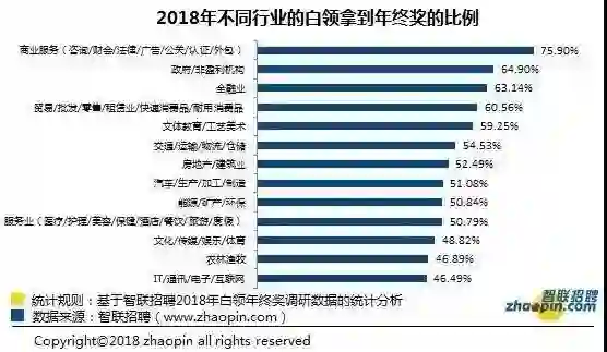 从行业来看,互联网行业白领能拿到年终奖的比例在13个参与排名的行业中垫底,仅有46.49%的白领表示能拿到年终奖。