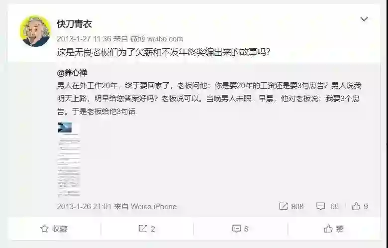 2013年春节前夕,搜狐媒体中心员工邓鑫鑫在新浪微博上看到了一条鸡汤文,大意是说一个男人在外工作20年,终于要回家了,老板问他:你是要20年的工资还是要3句忠告?男人选择了要三个公告,故事的结尾是男人既得到了忠告也得到了20个月的工资。