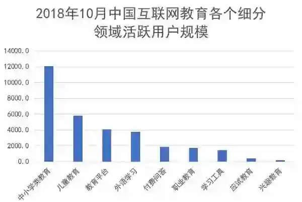 根据Analysys易观数据显示,中小学类教育用户规模最大。2018年10月中小学类教育、儿童教育、教育平台领域月活用户分别达到12073.2万人、5790.4万人、4090.6万人。