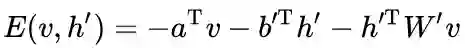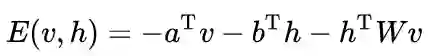 Hinton 把神经元的偏置 (对于可见层记作 a,对于隐含层记作 b ) 作为 Ising model 的「外场」,NN 的权重 W 作为 Ising Model 的「内部耦合系数」(两个神经元之间的权重越大,代表它们的耦合越强,关联越强),于是能量就可以写作非常简单的形式: