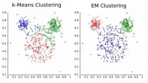然而即使如此,两个聚类算法的不同的先验知识仍然导致不同的结果。上面图中,k-Means 的先验更强调 cluster 的大小均匀性(损失是聚类中心到类成员的距离平方),因此有大而平均的聚类簇;而高斯 EM 聚类则更强调密集性(损失是中心到成员的距离的指数),因此有大小不一但是密集的聚类簇。(大多数人更加偏向 EM 的结果,这大多是因为我们对米老鼠的,或者对动物头部的先验知识,希望能够分出「耳朵」和「脸」)