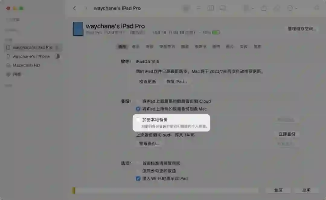 如果你的 iCloud 空间有限,还可以选择用 Mac 上的 Finder 或者 Windows 上的 iTunes,在电脑本地备份系统数据。为了保证数据传输的稳定性和效率,我们推荐你使用有线连接的方式连接电脑和手机、平板设备,而不要使用无线方式进行连接和备份。如果你希望备份账户密码、健康应用和 Homekit 中的数据,请勾选「加密本地备份」。之后选择立即备份,等待备份完成。