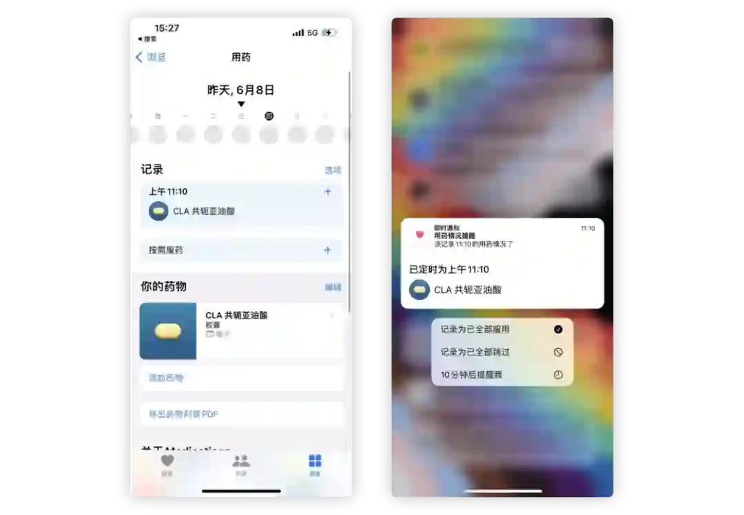 对于有日常药物服用需求的用户,可以在「健康」>「浏览」>「用药」中设置并管理自己日常药物。设定好药品和服用时间后,iOS 可以按时提示你去服用药物,并记录服药记录。此外,还支持一键导出自己的药品清单,方便购买时使用。