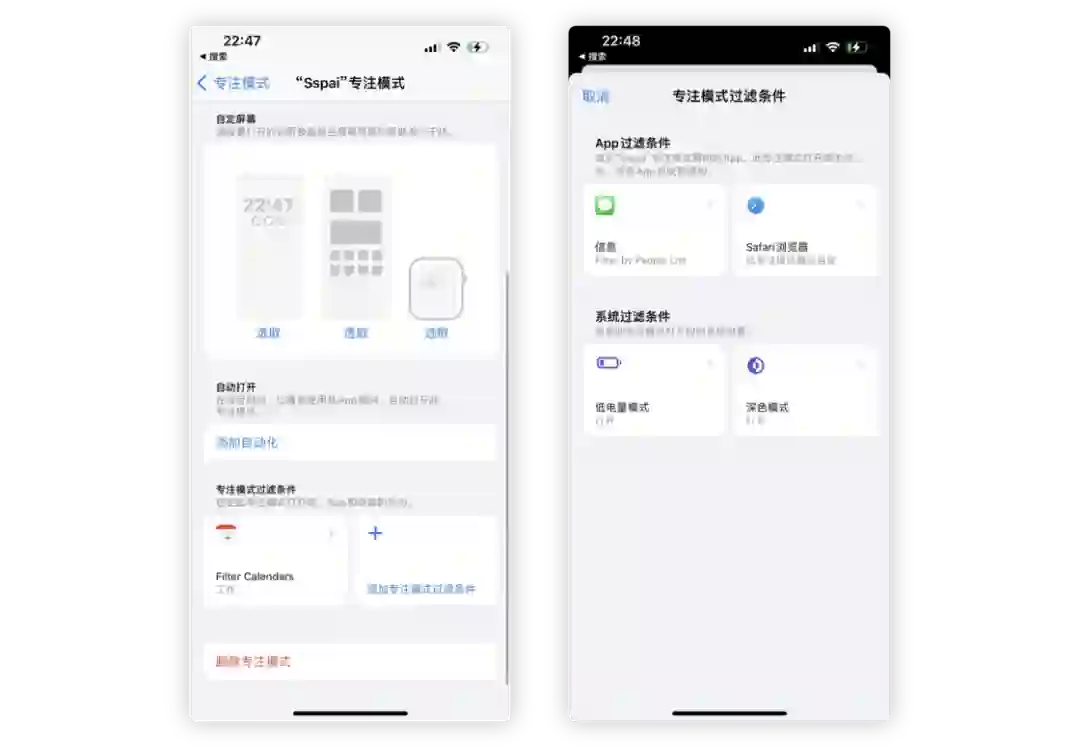 此外,这次 Apple 还提供了一项专注模式过滤条件。在这里你可以针对日历、信息、浏览器、低电量模式、深色模式进行更加细致的设定。例如,当相应的专注模式开启时,日历会会被筛选,其余的日历无法查看,系统会自动开启等等。这样一来,专注模式的功能变得更加自动化、更加个性化。相信在以后的更新中,专注模式应该可以做到更多的事情。