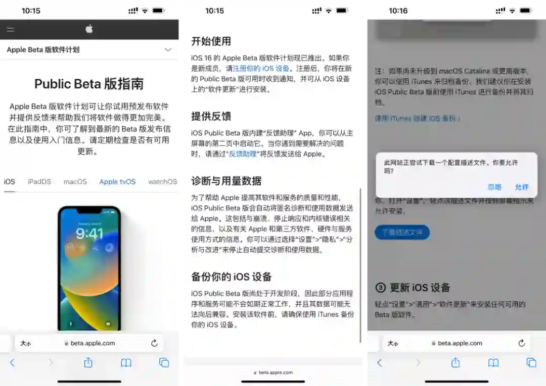 之后,在 iOS 的 Public Beta 页面中下载描述文件,系统会提示安装配置描述文件,点击「允许」。