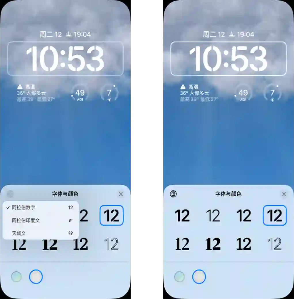 中间时间部分,Apple 不仅调整了占位大小,还提供了阿拉伯数字、阿拉伯印度文、天城文三种文字,每种文字包含了多种不同的设计。针对色彩部分,你可以在最下方选择背景适配色彩,也可以选择纯白色。