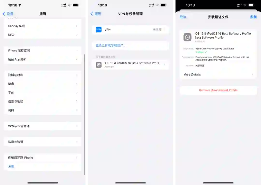 在系统设置中找到「通用」>「VPN 与设备管理」选项中,选择刚刚下载的描述文件,点击「安装」,输入设备锁屏密码并同意安装协议,重启你的 iOS / iPadOS 设备。之后,你就可以在「设置」>「通用>「软件更新」中更新设备了。