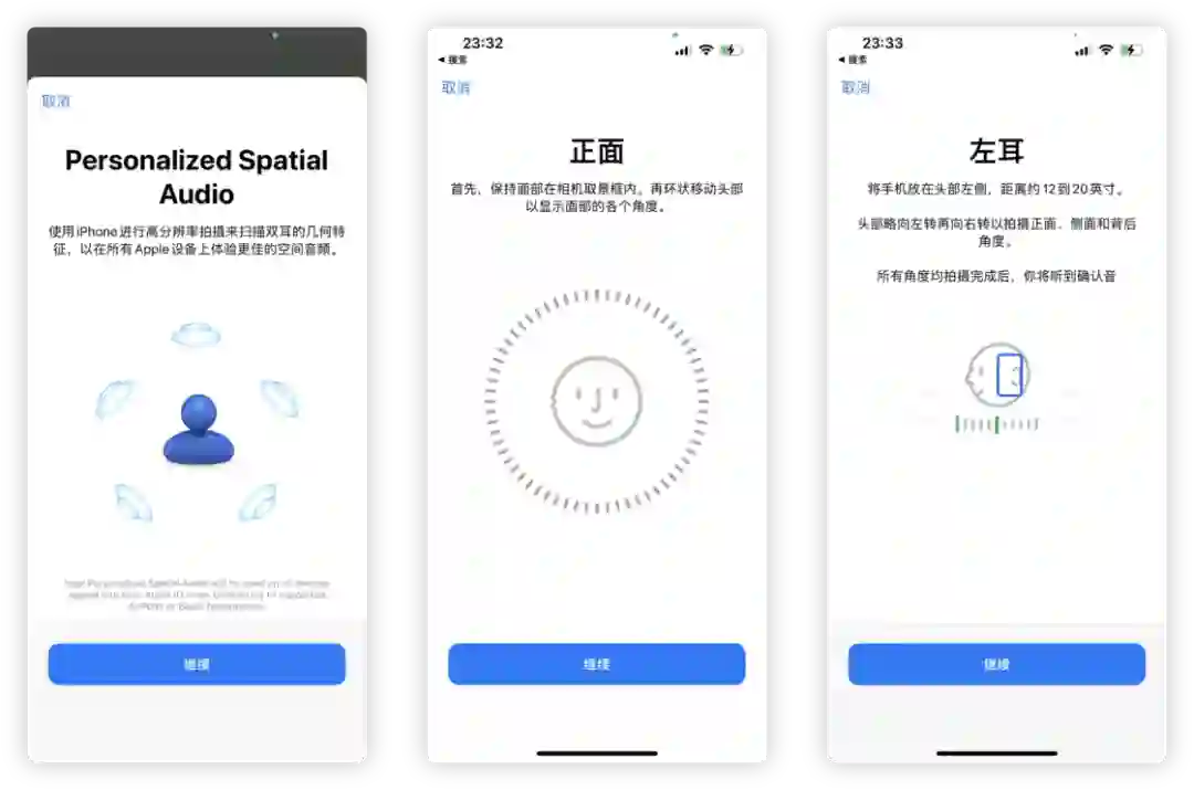 iOS 16 中,Apple 再一次优化了空间音频的体验。当你首次设置 AirPods 系列产品时,系统会自动提示将为你定制个性化的空间音频,然后会通过 Face ID 对你的面部以及左右耳进行扫描,在系统中生产属于你专属的几何特征,然后对空间音频进行个性化的适配。(个人觉得目前没有听出太大的区别)