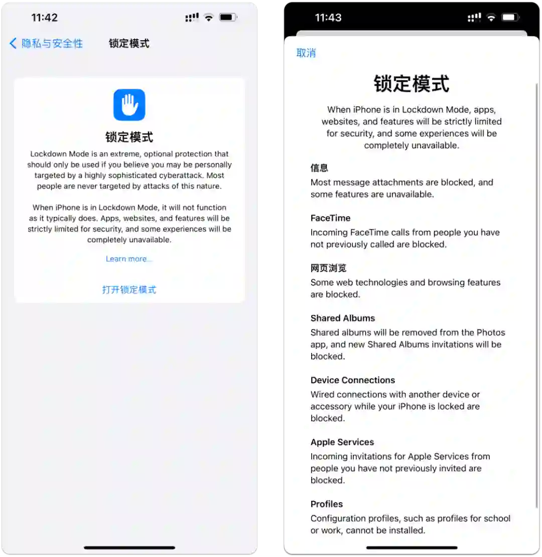 在 iOS 16 中,Apple 推出了名为「锁定模式」的新功能,我们可以在「隐私与安全性」>「锁定模式」中打开它。