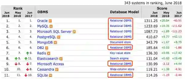 截止至2018年6月,排名前6位的数据库,仅有排名第5的MongoDB是文档型数据库,其余全部是关系型数据库,且前3位所占有的比重远远领先于其后的其他数据库。