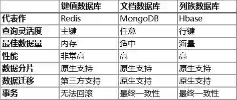 总的来说,NoSQL数据库的种类繁多,分别适合用于不同的场景。我们通过下表简单对比一下前文介绍的三种类型NoSQL数据库: