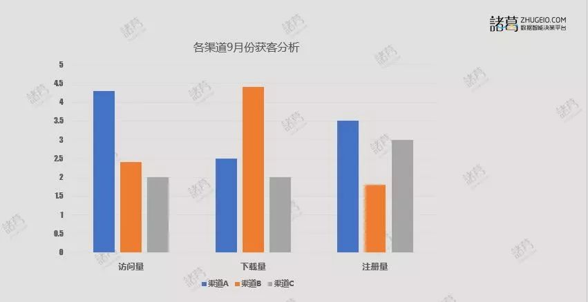 上面这张柱状图是针对9月份各渠道获客统计的一个对比分析图表,针对各渠道的下载量、访问量、注册量进行对比。