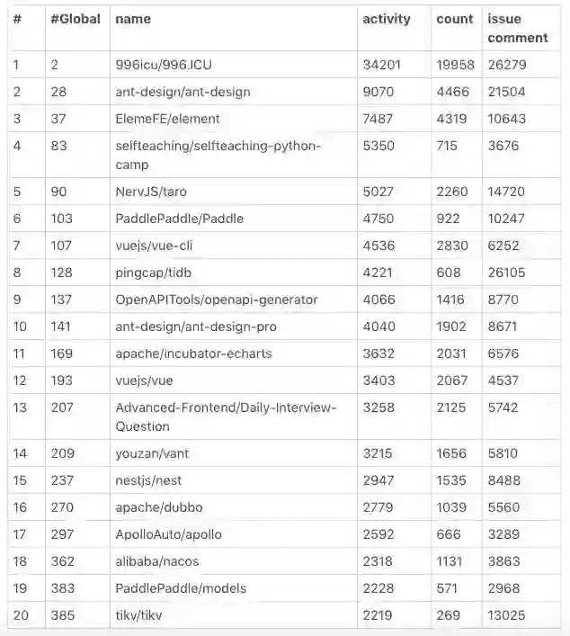从 Top 20 列表信息中我们可以看出,996icu/996.ICU 的综合活跃度数值远远高于其他项目,数值上超过其他项目一个数量级。
