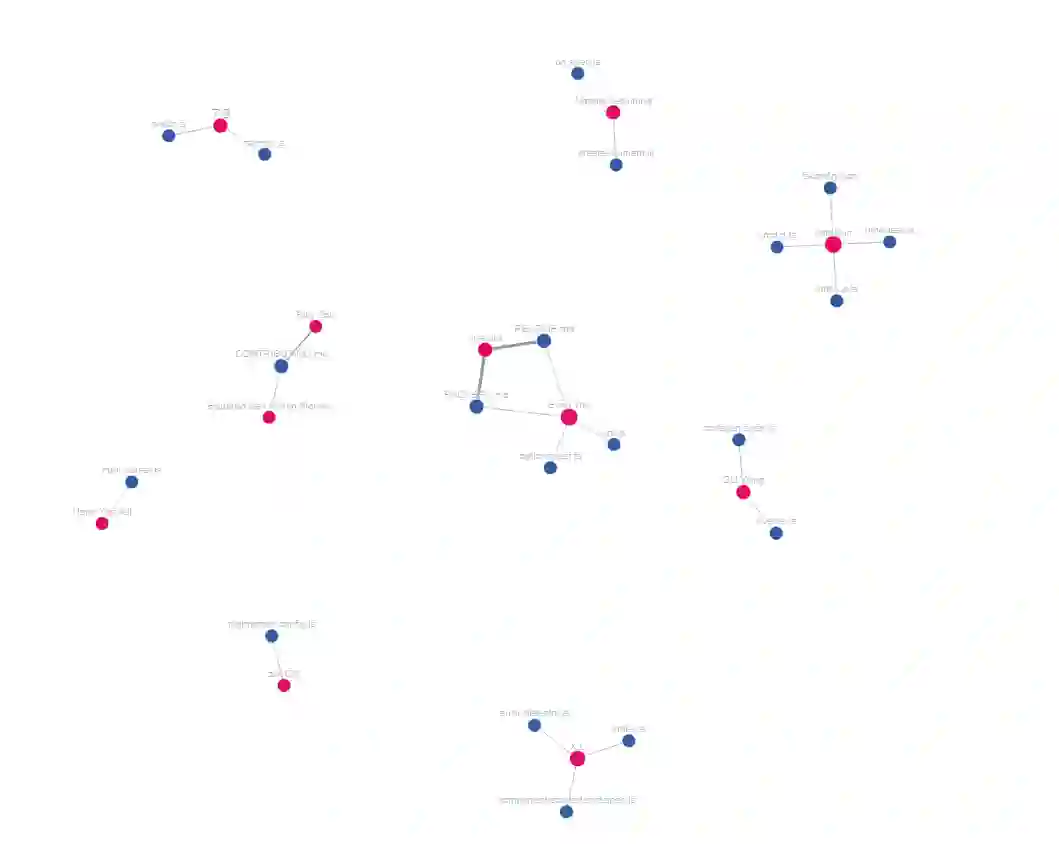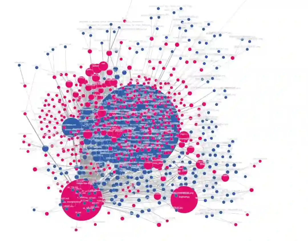 针对排名前 20 的中国开源项目,我们对仓库的历史 commits 记录进行挖掘,并做了可视化展示(蓝色节点代表仓库文件,红色节点代表用户)。Git 仓库中的每一个 commit 记录由贡献者产生,对仓库的一个或者多个文件产生影响,因此对特定时段内的所有贡献者的提交记录分析能反映出贡献者的活跃程度、协作模式以及项目社区本身的类型属性。