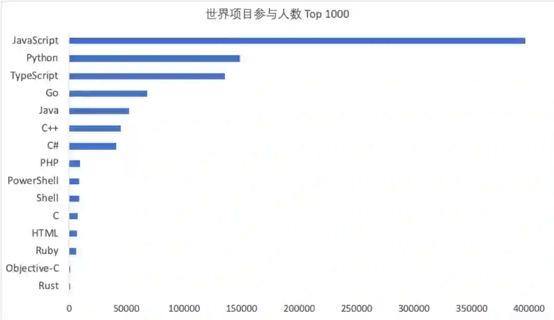 我们分别对世界项目活跃度 Top 1000 的项目、世界项目参与人数 Top 1000 的项目和中国开源项目统计了不同开发语言的项目数量以及使用不同开发语言进行 PushEvent 操作的开发者的数量,二者相乘估计使用不同开发语言的开发者的数量,可以发现 JavaScript 使用最多。