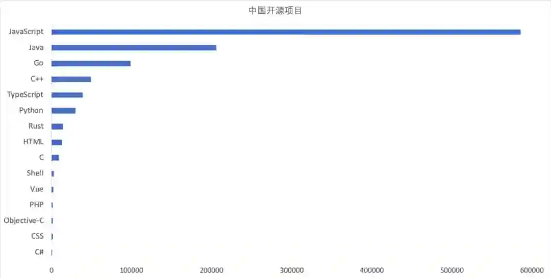 在中国开发者社区中,我们发现除了 JavaScript 外,Java 和 Go 的活跃度也很高,分别排在第二、第三。