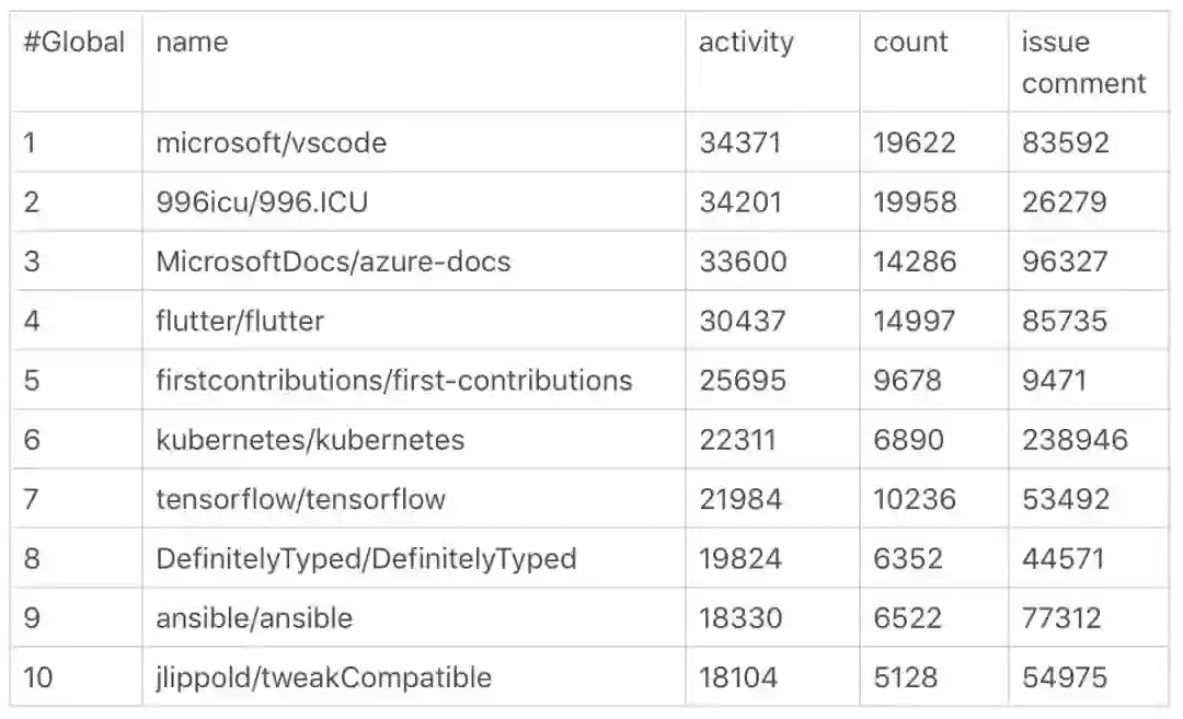 而活跃度最高的项目则是来自微软的跨平台代码编辑器 Microsoft/vscode;此外微软使用开源的方式来建设其 Azure 云平台的项目 MicrosoftDocs/azure-docs 排名第三,显然微软在开源上的努力获得了程序员的认可。
