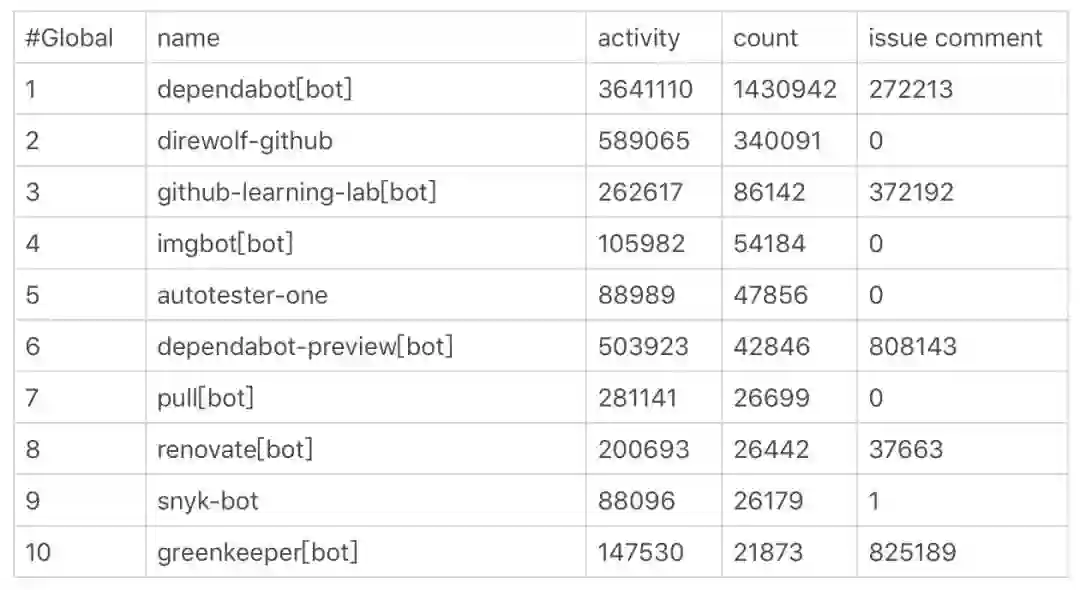 我们对 2019 年全年活跃开发者进行了活跃度统计与排名,这里给出世界活跃度 Top 10 的开发者账号列表: