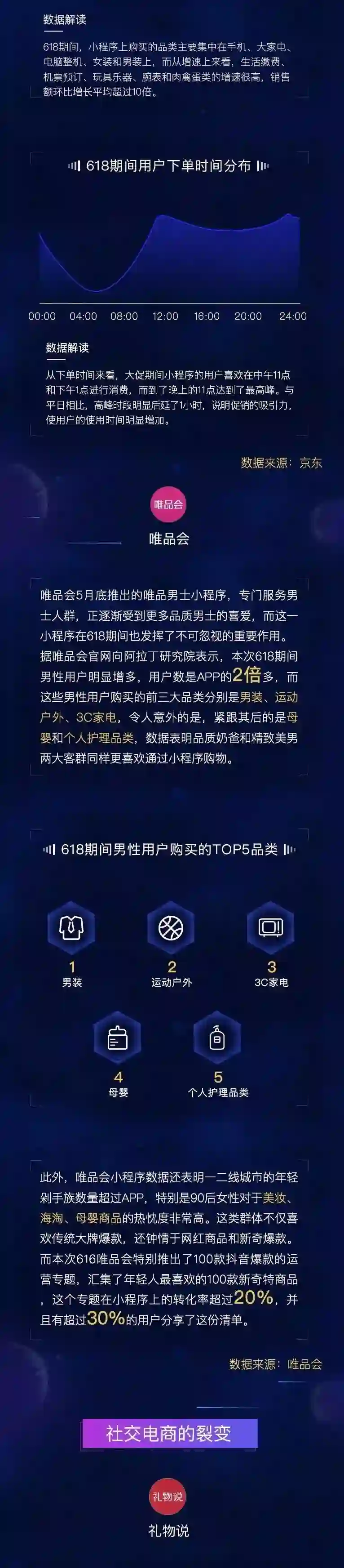 举例而言,唯品会616小程序大促的逻辑,是利用微信环境下的社交裂变能力,结合内容深挖社交流量,做差异化运营。
