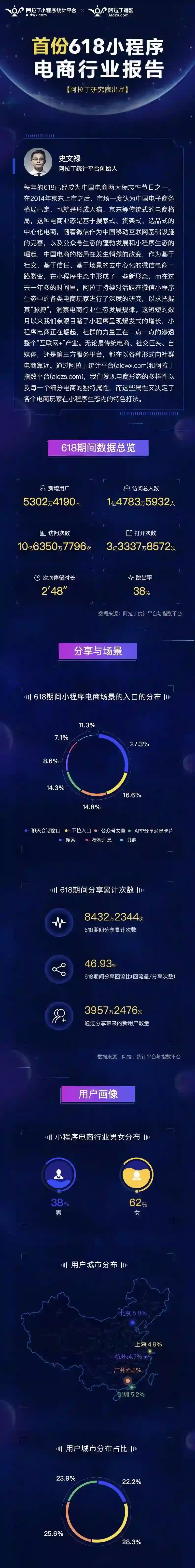 根据阿拉丁小程序数据平台统计,618期间,通过聊天会话窗口进入小程序的流量,占比27.3%,微信平台用户分享小程序共计超过8432万次,通过分享带来的新用户数量超过3957万位。