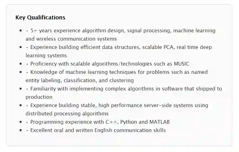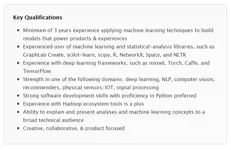 学历和工作经验:机器学习、统计学、计算机科学、物理以及相关专业的博士 + 5 年以上的机器学习研究经验;机器学习、统计学、计算机科学、物理以及相关专业的硕士 + 7 年以上的机器学习模型业界经验